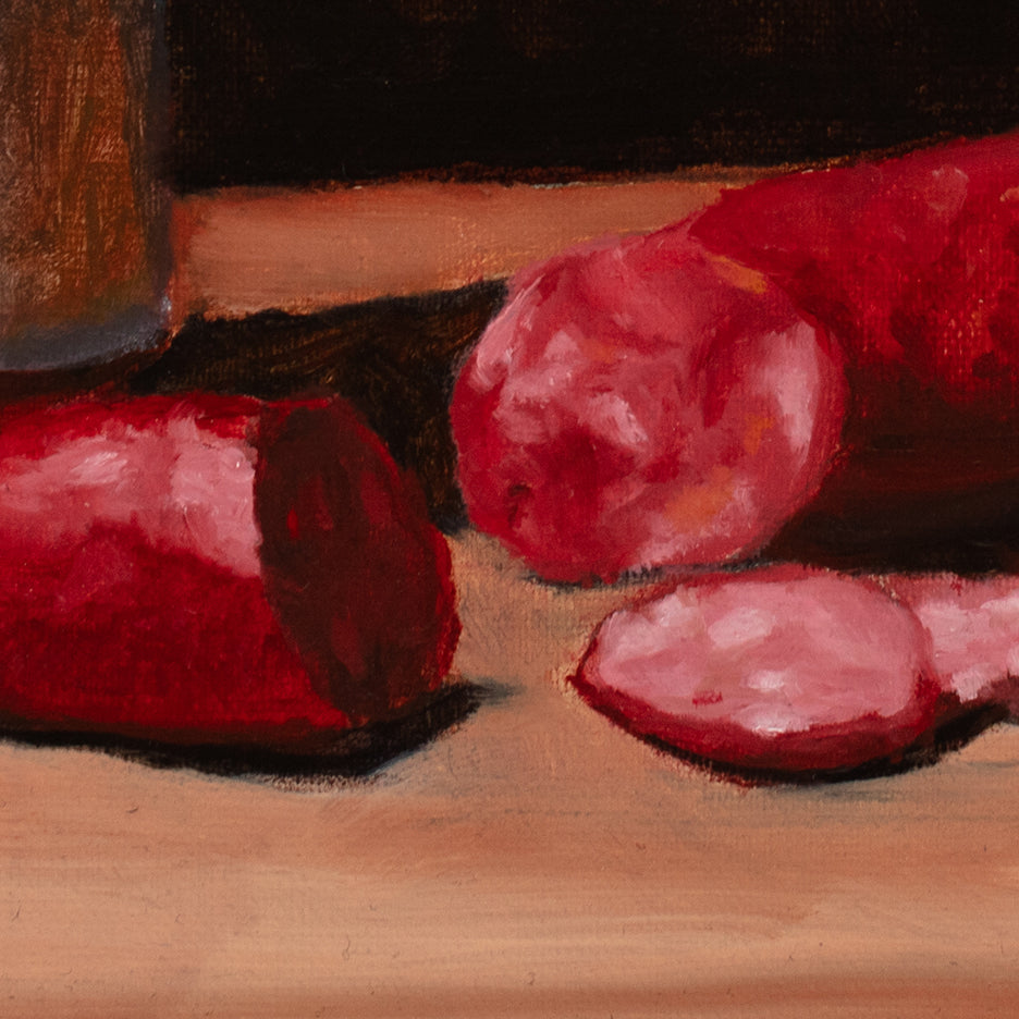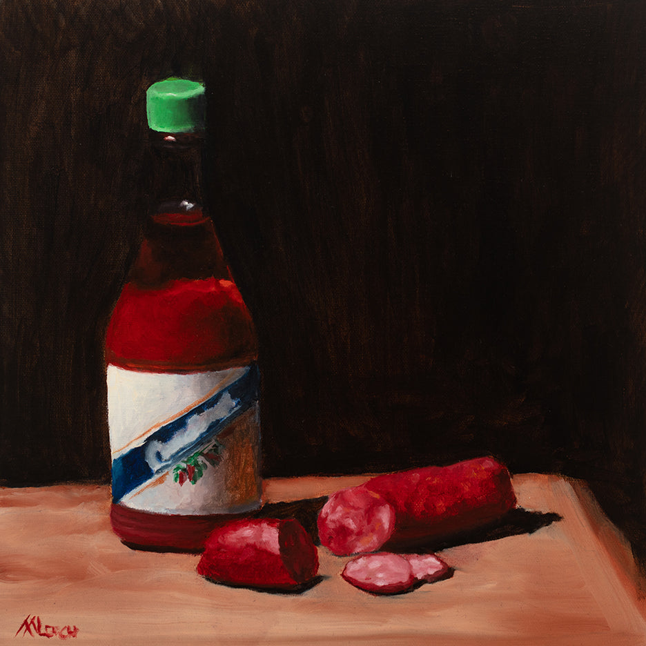 Andouille sausage and hot sauce are two components of Cajun cuisine that are seemingly as essential as the Holy Trinity; this impressionistic still life highlights their importance.